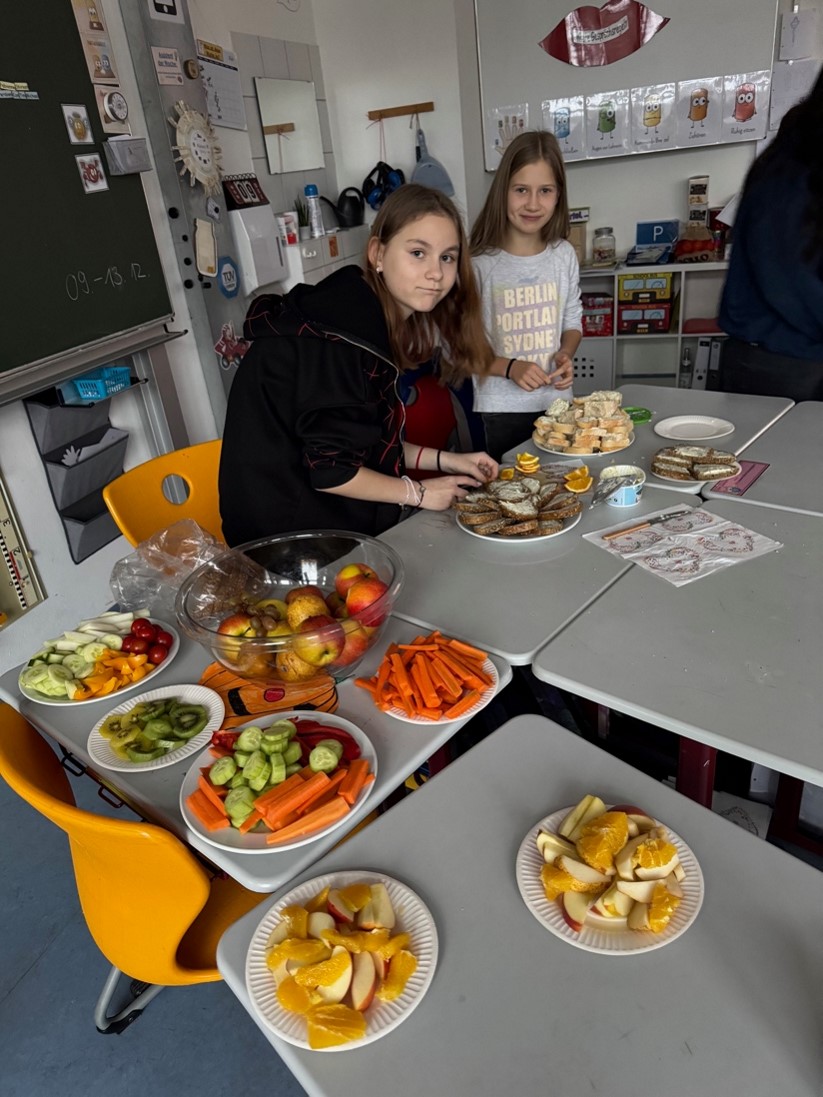 Zwei Schülerinnen aus der Klasse 5b bei der Zubereitung des Klassenfrühstücks: