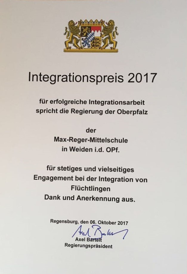 Am 6. Oktober 2017 war der Rektor unserer Schule Herr Karl-Heinz Badenberg mit den Initiatorinnen des Projekts `Sunset in the dessert` - Multi Kulti, Fachoberlehrerin Jutta Bock sowie Fachoberlehrerin Kornelia Sparrer, in Regensburg um von Staatsministerin Emilia Müller im Regierungssaal der bayerischen Staatsregierung eine Anerkennungsurkunde für erfolgreiche Integrationsarbeit entgegenzunehmen!