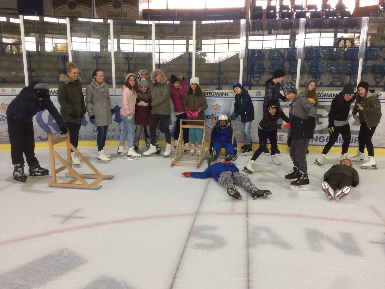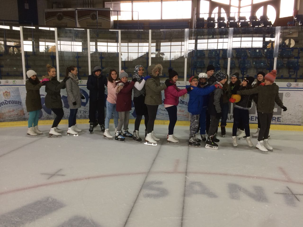 17 Schüler sind mit von der Partie. Es kam zu keinem Unfall. Alle Teilnehmer machen gute Fortschritte und es bereitet viel Spaß. Außerdem stellten wir fest, dass Bewegung müde macht.  2 Schüler bekamen sogar neue Schlittschuhe von den Eltern!