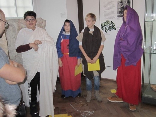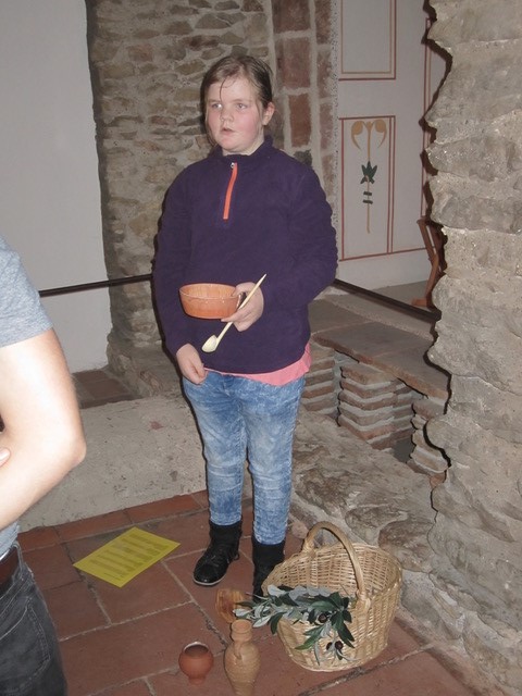 Dort angekommen starteten wir erst einmal mit einem gemeinsamen Rundgang, bei dem uns der Museumsführer noch viel Neues und Erstaunliches berichtete. Anschließend wurden wir in Gruppen aufgeteilt. Zu dritt oder viert beschäftigten wir uns dann mit verschiedenen Bereichen des römischen Lebens, wie z.B. der Mode, der Esskultur, der Freizeit und der Bauweise der Römer sowie dem römischen Soldaten. Dafür wurden wir mit Material und Repliken römischer Utensilien ausgestattet. Nach der Erarbeitungsphase präsentierten wir uns gegenseitig unsere Ergebnisse. Dabei sind tolle Fotos entstanden!