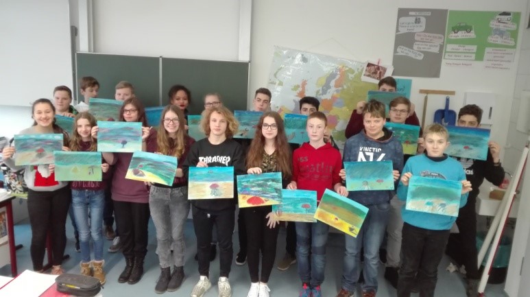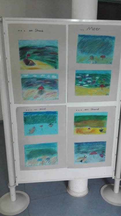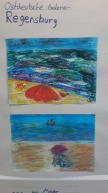 Dann durften oder mussten(?) die Schüler das Bild mit Pastellkreiden nachgestalten. Es kamen ganz tolle Werke heraus, die mit nach Weiden „transportiert“ und dann einige Zeit im Schulhaus ausgestellt wurden. Hier unsere Werke: