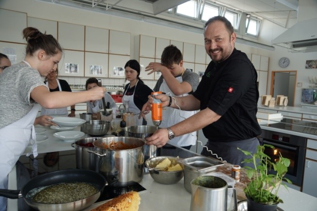 Nach den Osterferien erlebten die Schülerinnen und Schüler der neunten Jahrgangsstufe eine etwas andere Unterrichtsstunde im berufsorientiertem Fach Soziales. Die Fachlehrerinnen Frau Bock und Frau Trottmann holten den Profikoch und Leiter der Kochschule „Grünes Gut“ Herrn Andreas Meier in die Schulküche der Max-Reger-Mittelschule. Herr Meier bereitete mit den Schülern ein schmackhaftes Menu zu und gab ihnen wertvolle Tipps.
