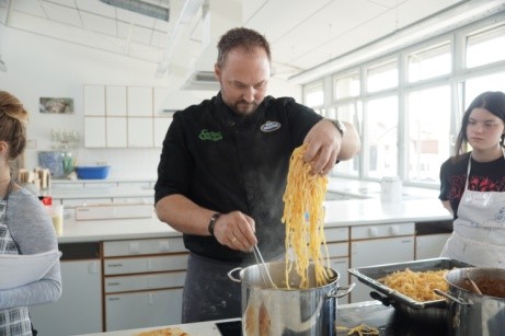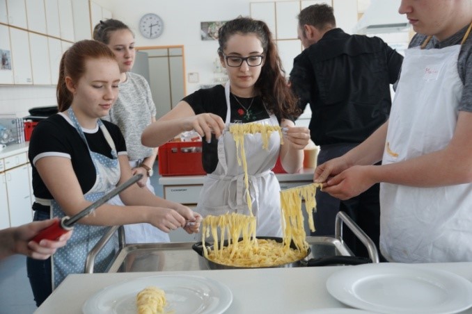 Der Hauptgang bestand aus selbstgemachten Tagliatelle, Hähnchenschenkel und mediterraner Tomatensoße. Die Schüler staunten über das Zerkleinern der Hähnchenschenkel, wiederholten die Sicherheitsmaßnahmen im Umgang mit Geflügel (Salmonellen) …