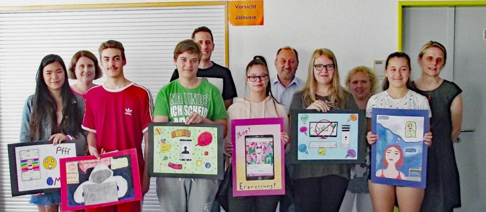 Trotz bevorstehender Quali-Prüfungen und trotz des Betriebspraktikums befassten sich die Teilnehmer intensiv mit dem Projekt. Es war nicht leicht für die Jury – bestehend aus Sabine Kuran, Tom Bierler, Louisa und Karlheinz Badenberg – die Gewinner zu ermitteln, denn alle Bilder warnten eindrucksvoll vor dem leichtfertigen Umgang mit dem Handy oder PC. Preisträger der Klasse M 8: 1. Kimberly Schmegner (Müller-Gutschein), 2. Titian Oswald (Eisgutschein), 3. Jirawan Prasert (WTW-Gutschein). Preisträger der M 9: 1. Platz und Bild für den Flyer zur Aktion Nina Wolf (Müller-Gutschein), 2. Jasmin Meyer (Eisgutschein) und 3. Jan Kambach (WTW-Gutschein).
