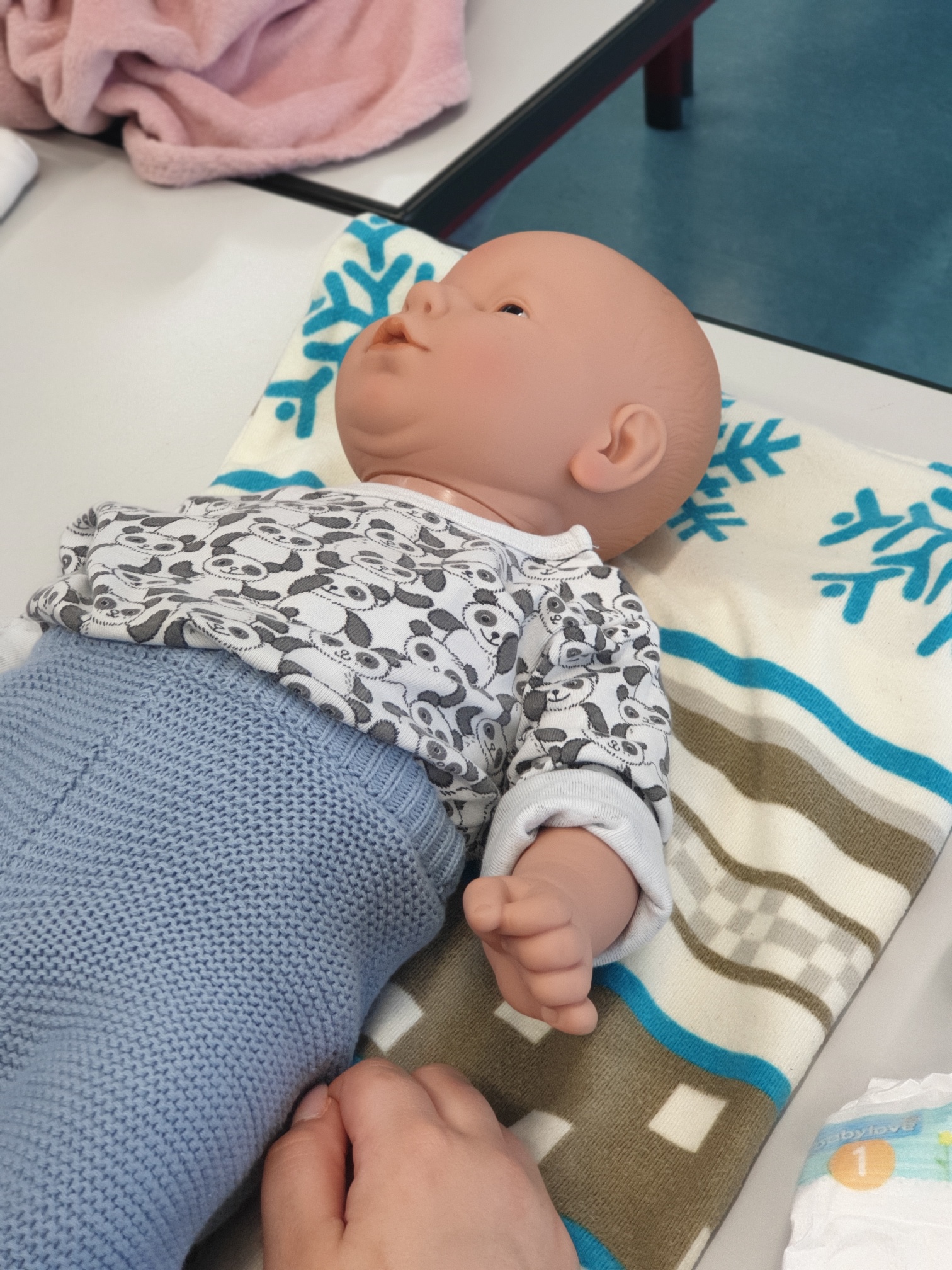 Ein Highlight war wie jedes Jahr der Besuch der Hebamme Frau Susanne Hausdorf, die den Projektteilnehmern sehr anschaulich einen Einblick in ihren Berufsalltag gab. Zudem vermittelte sie den Max-Reger-Schüler*innen einfache Handgriffe bei der Pflege von Neugeborenen.