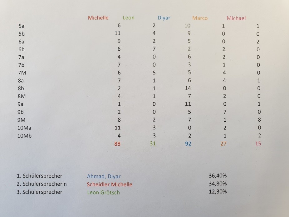 Im Anschluss an die Wahl des Verbindungslehrers, erstellte die Klassensprecherkonferenz eine Kandidatenliste für die Schülersprecherwahl. Die meisten Stimmen bekamen Marco Meyer 9a, Leon Grötsch 10 Ma, Michelle Scheidler 10 Ma, Michael Sultanmuratov 9 M sowie Diyar Ahmad 9 a.