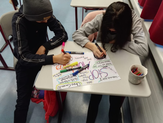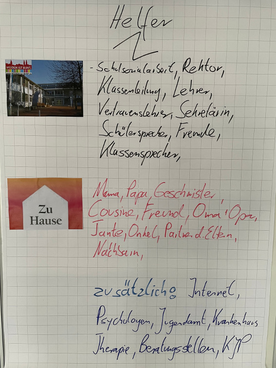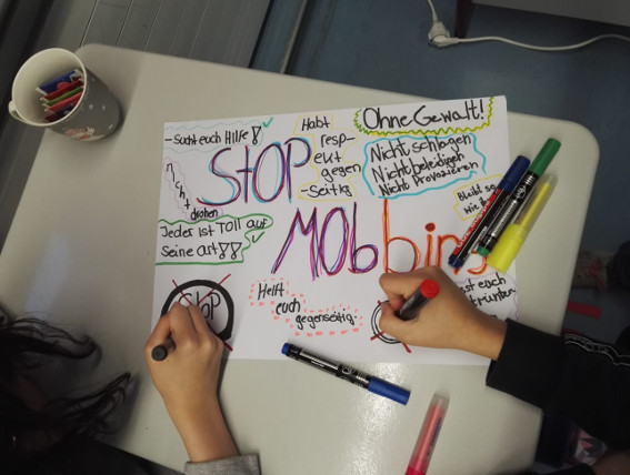 Mit Hilfe des Films Mobbers End, vertieften die Siebtklässler ihr Wissen und erlangten nach und nach ein besseres Gespür und Bewusstsein für Situationen in den Mobbing auftreten können. Zudem erarbeitete man gemeinsam ein „Helferplakat“, welches die ganze Breite möglicher Hilfen im Falle von Mobbing darstellte.