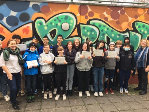Frau Röhr (links) und Frau Schaller (rechts) gemeinsam mit der sechsten Klasse von Frau Guggenmos