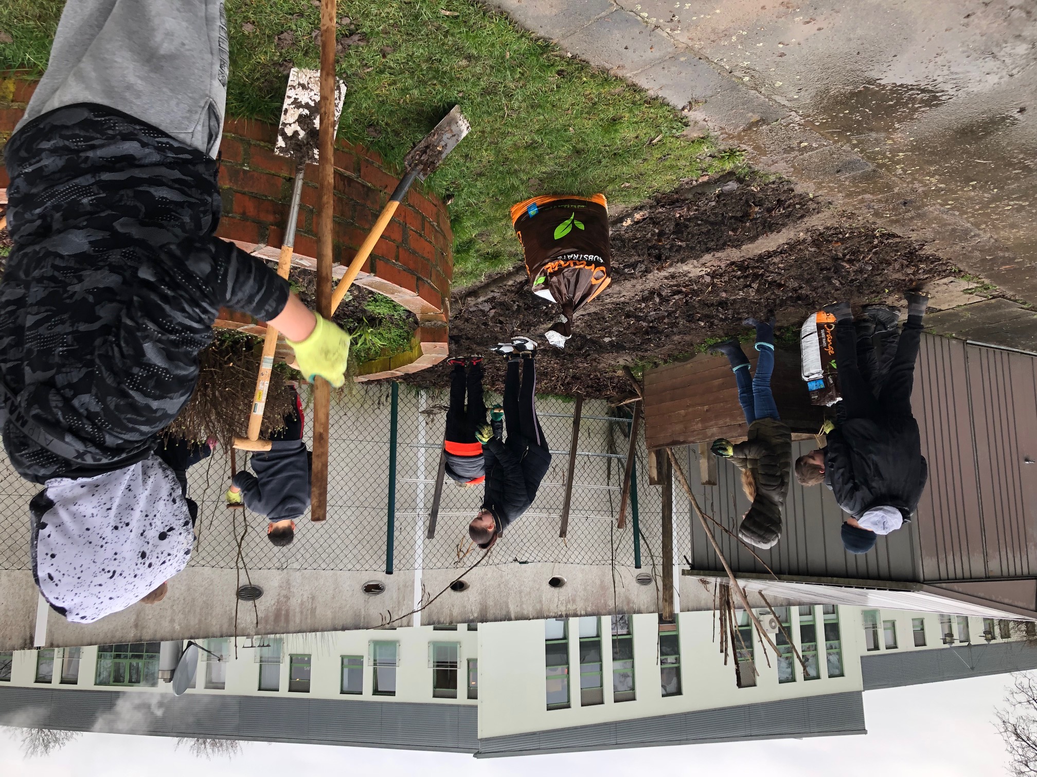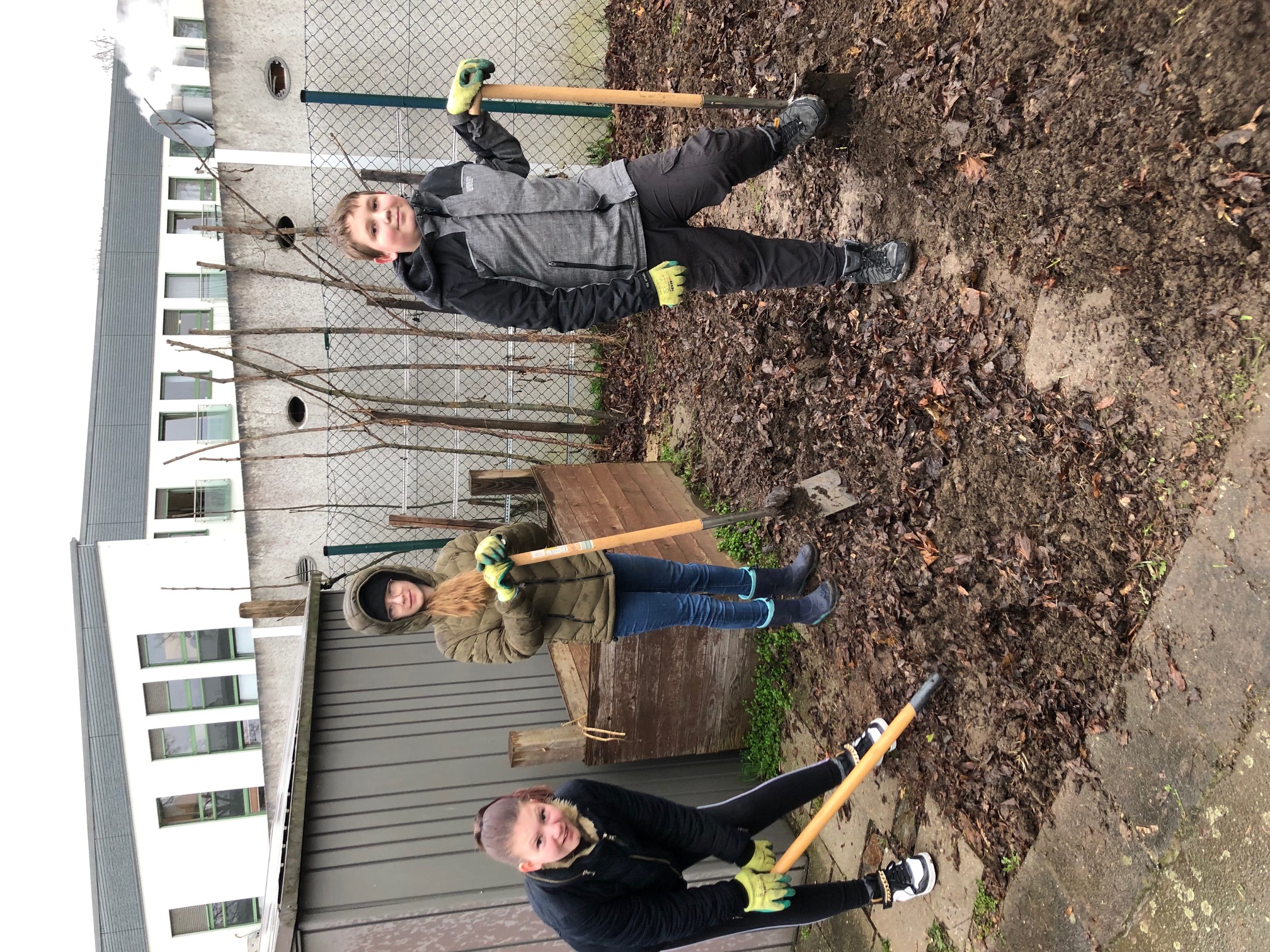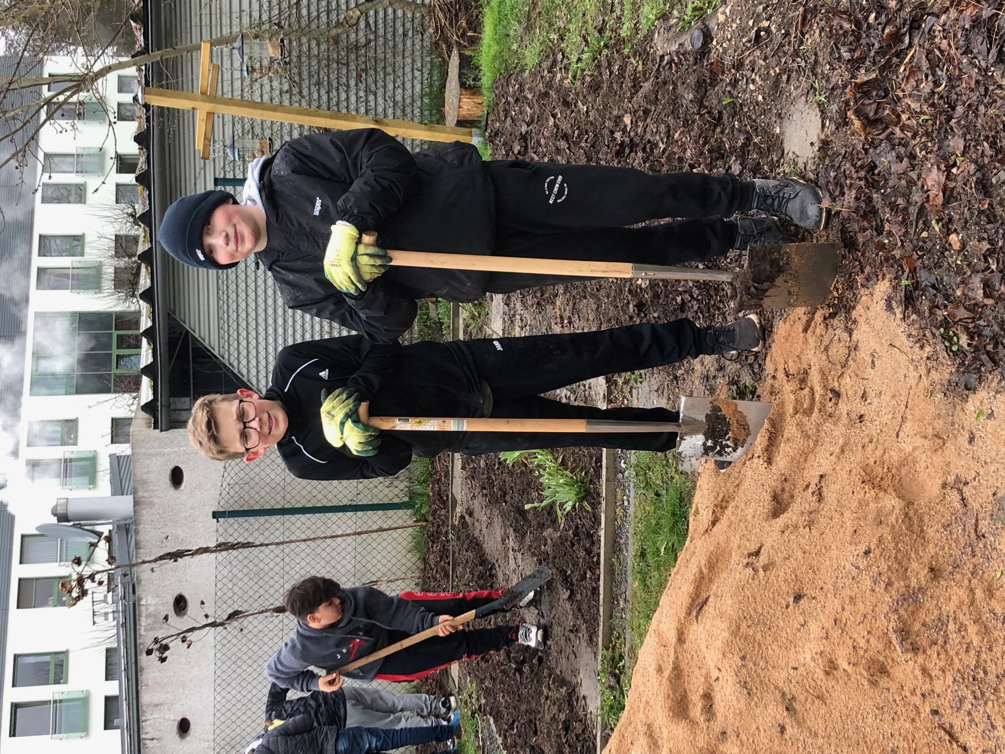 Vier Wochen vor der ersten Pflanzung geht es für ein paar fleißige Schüler/innen der Klassen 6a und 7M mit dem Spaten schon einmal auf den Acker. Unter Anleitung von Frau Ram und dem Ackercoach Frau Weber können sie beim Umgraben –trotz Regen– erste Frühlingsluft schnuppern und einen Vorgeschmack auf all die spannenden Ackerstunden bekommen, die im Frühjahr bevorstehen: