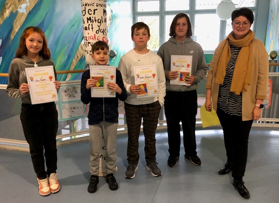 Wie schon die letzten Jahre wurden die Schüler, die am besten abgeschnitten hatten, von Frau Eich und Frau Ram mit Urkunden und einem kleinen Präsent ausgezeichnet. Diese gingen in diesem Schuljahr an: Sina Ratter, Maxim Tyurin, Andrei Stengauar und Angelino Groß.