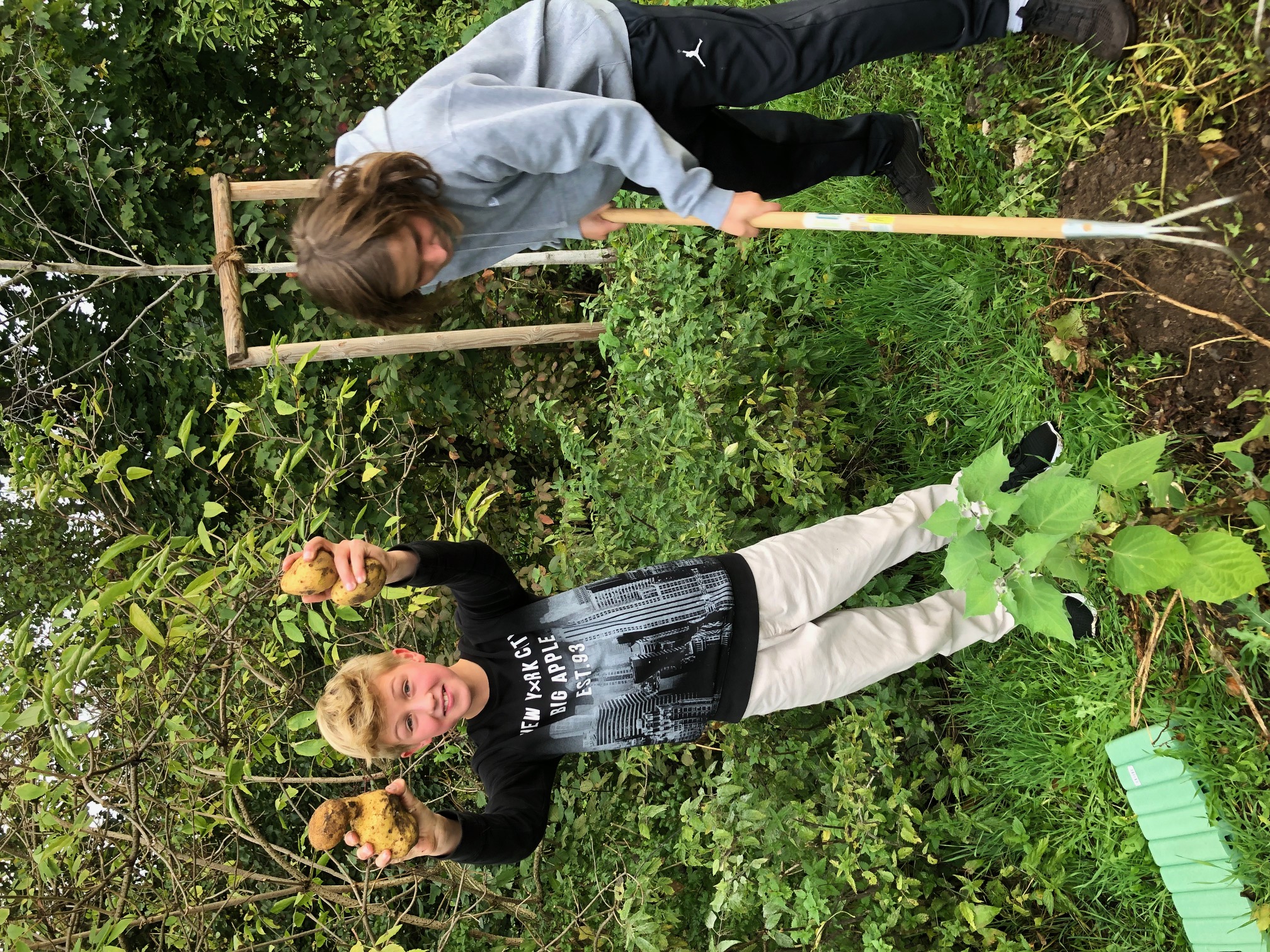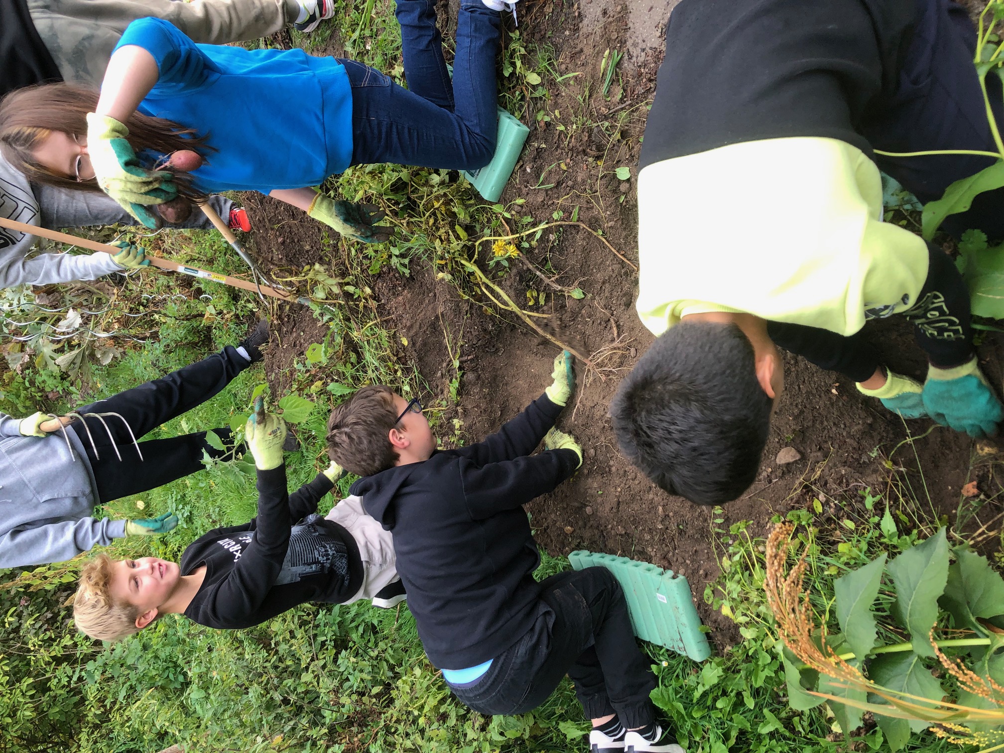 Kurz vor Beginn der Herbstferien machten sich einige fleißige Schülerinnen und Schüler der Ackerklasse 6a mit Frau Ram an die Arbeit, die Kartoffeln im Schulgarten zu ernten: