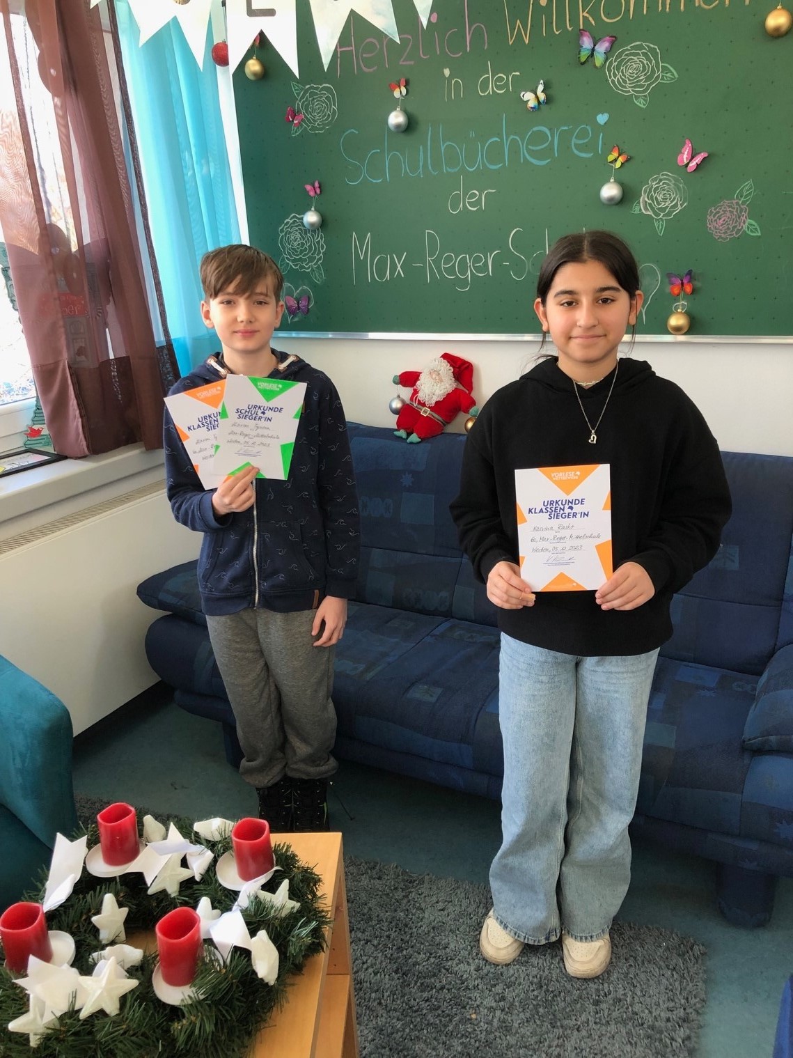 Bundesweit lesen jedes Jahr rund 600.000 Schüler/innen der 6. Klassen beim Vorlesewettbewerb um die Wette. Er ist einer der größten und traditionsreichsten Schülerwettbewerbe Deutschlands. In diesem Schuljahr setzten sich an unserer Schule Maxim Tyurin und Nasvina Rasho gegen ihre Mitstreiter/innen durch.