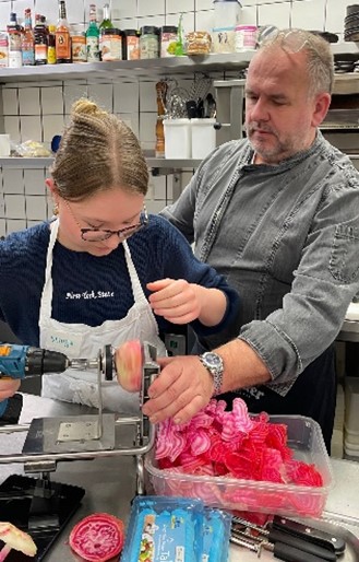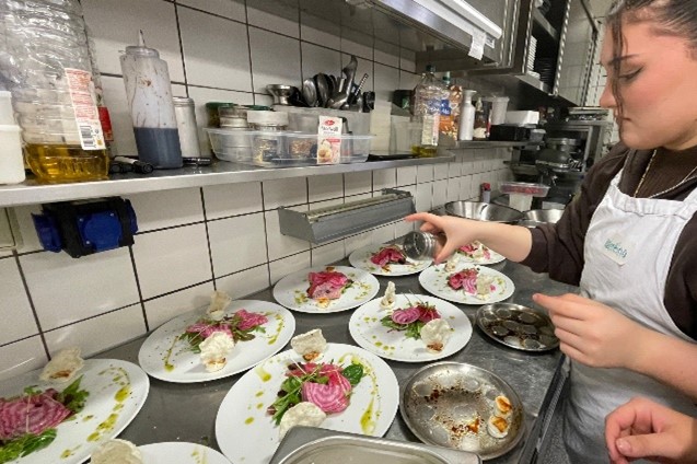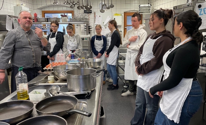 Nach dem Zwischenzeugnis besuchten die Schülerinnen und Schüler der Klasse 9M das Restaurant Zoe. Herr Pufke, der Restaurantbesitzer und Küchenchef, bereitete mit den Schülern in der Restaurantküche ein leckeres und gesundes Menü zu. Dabei erfuhren die Schülerinnen und Schüler einiges über den Beruf Koch/Köchin und den alltäglichen Ablauf in der Gastronomie.