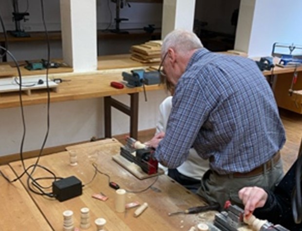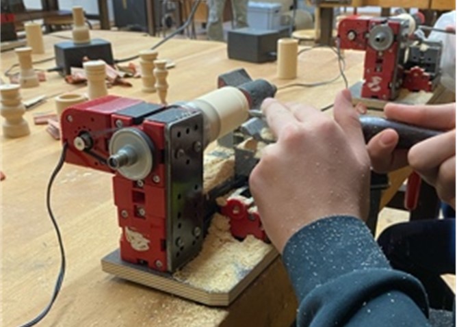 In diesem Kurs wurden den Schülern und Schülerinnen, unter Leitung von Herrn Spreng, das Kunsthandwerk „Drechseln" vorgestellt. Sie konnten an kleinen Drechselbänken direkt loslegen und die Späne fliegen lassen.