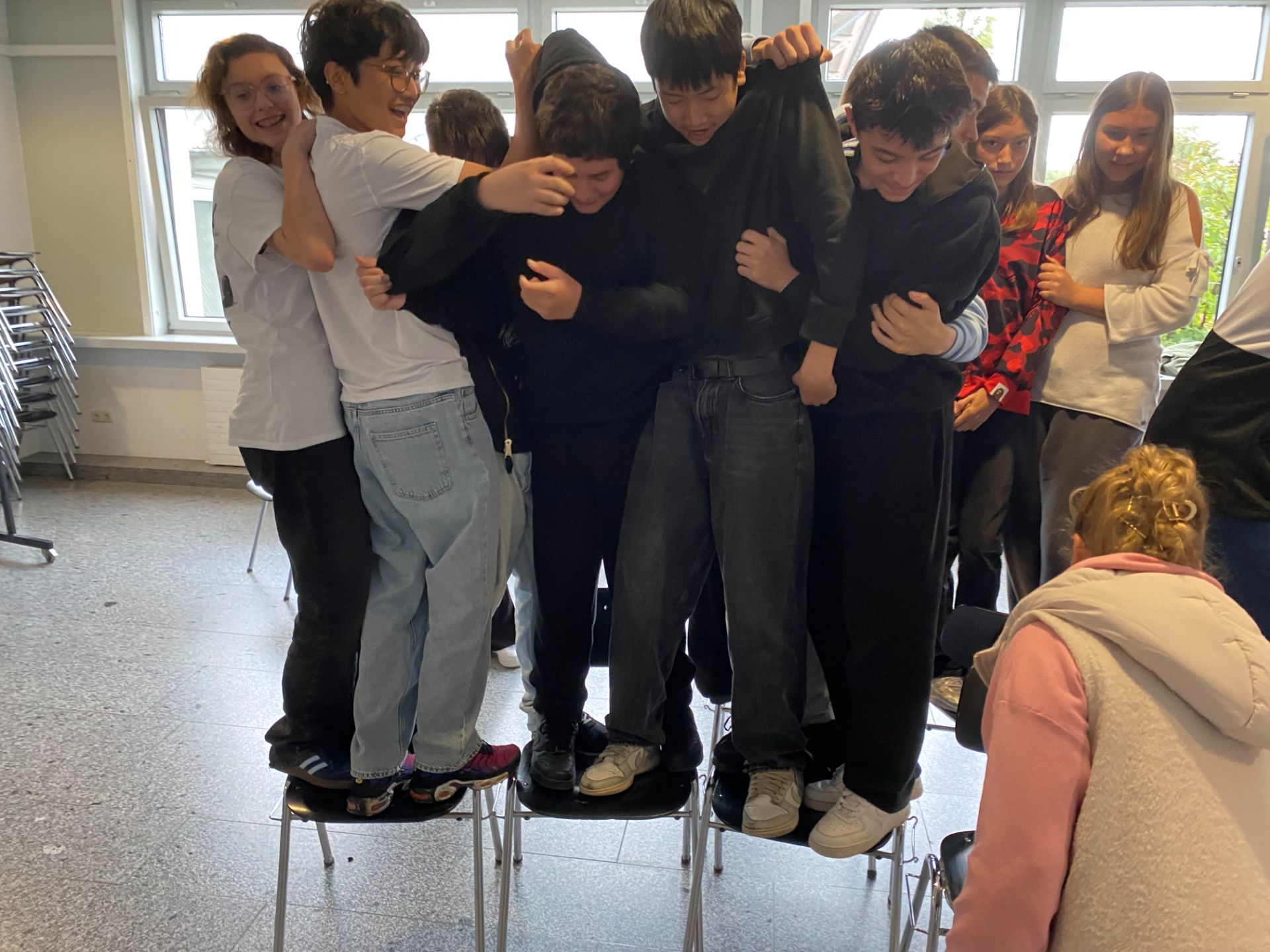 Mit vollem Körpereinsatz gelang es Herrn Bierler, die Schülerinnen und Schüler für Themen wie Teamgeist, Rücksichtnahme, Zusammenhalt und Respekt zu sensibilisieren. Die Spiele forderten die Klasse immer wieder heraus, gemeinsame Lösungen zu finden und Vertrauen aufzubauen. Auf spielerische Weise wurden dabei nicht nur der Klassenzusammenhalt gestärkt, sondern auch Maßnahmen gegen Gewalt und Mobbing erprobt.